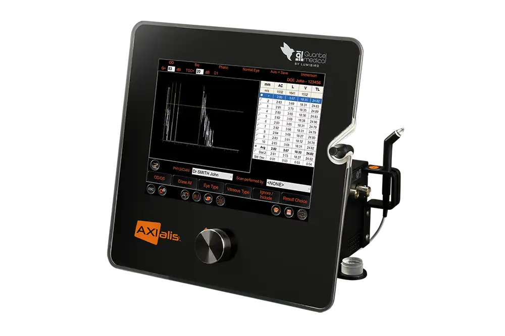 Ultrasone biometrie is een aanvulling op optische biometrie bij zeer dichte cataract of bij glasvochtbloeding. AXIalis™ is zeer nauwkeurig voor biometrie, voor implantaatberekening met in totaal 12 formules (inclusief formules voor post-refractieve chirurgie) en voor pachymetrie (optioneel) met geïntegreerde correlatietabellen tussen IOP en hoornvliesdikte.