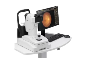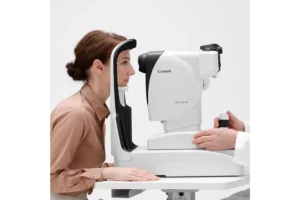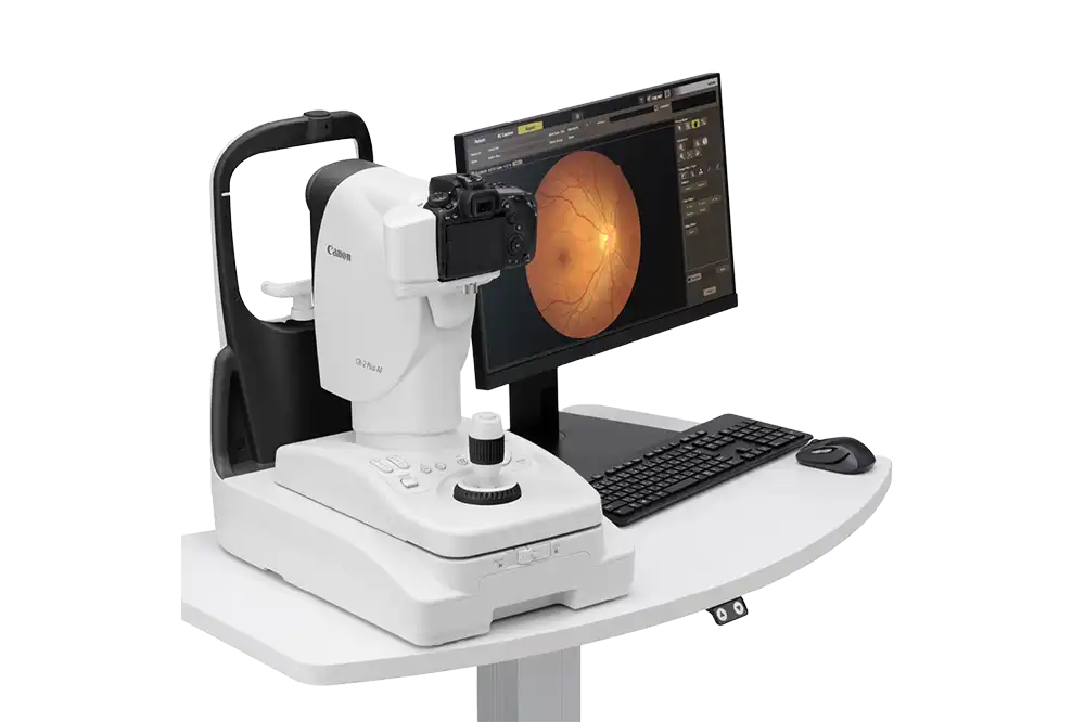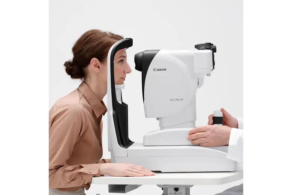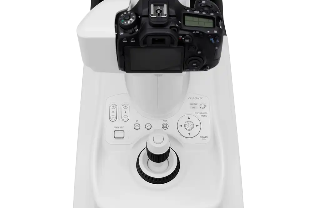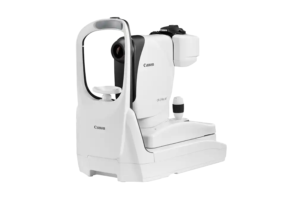 De Canon CR-2 Plus AF digitale non-myd retinacamera biedt kleurenopnames en Fundus Autofluorescentie (FAF)-beeldvorming in een compact ontwerp. FAF-beeldvorming geeft informatie over veranderingen in het netvlies die niet zichtbaar zijn met standaard kleurenfotografie.