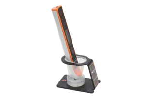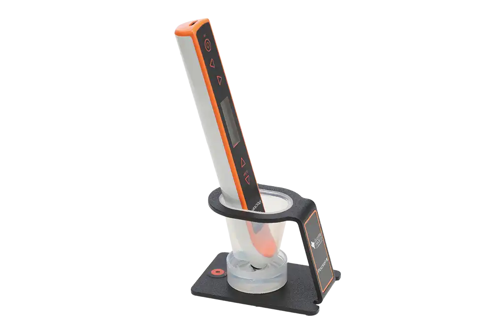 De houder van de POCKET III® maakt het mogelijk om het uiteinde van de sonde veilig onder te dompelen in een desinfectieoplossing. U kunt de meting van de sonde controleren en oefenen om loodrecht te meten met behulp van de testschijf aan de basis van de houder.