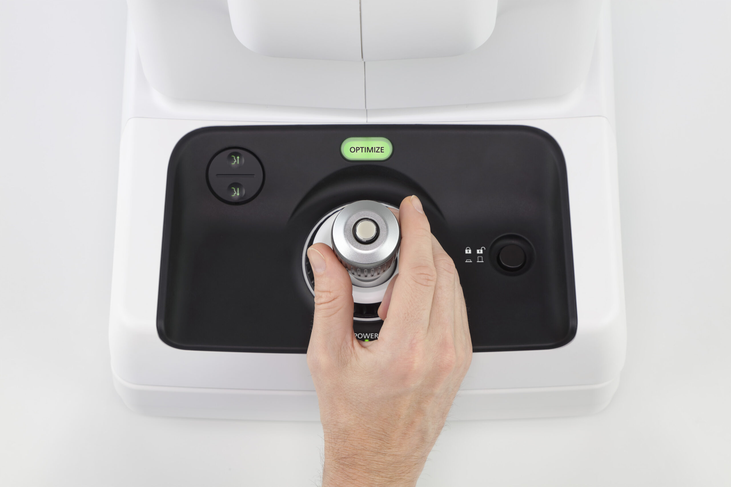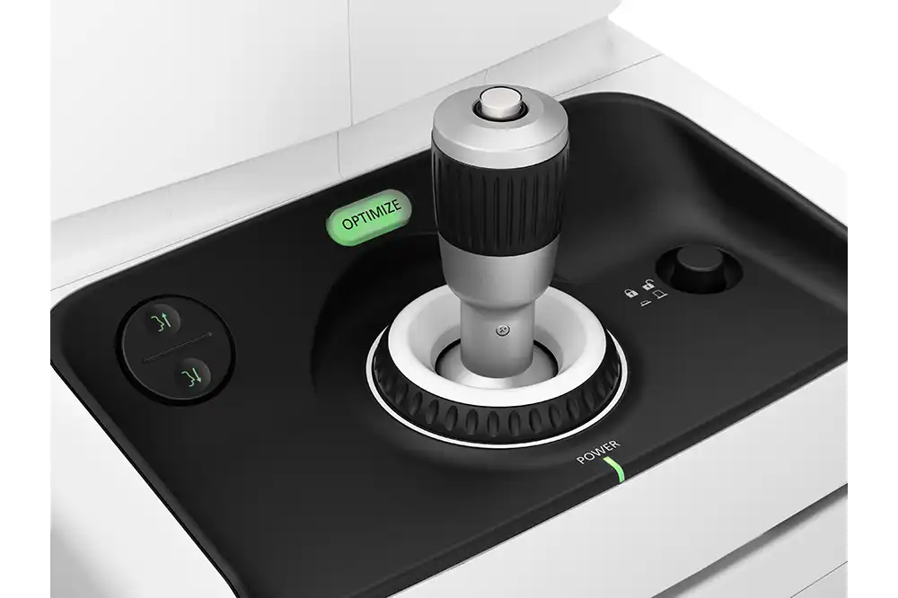 De SLO-camera met groot veld zorgt voor real-time retinale tracking en een nauwkeurige follow-up. De eenvoudig toegankelijke optimalisatiefunctie nabij de joystick zorgt voor het afstemmen van de uitlijning, de focalisatie en de scanpositie.